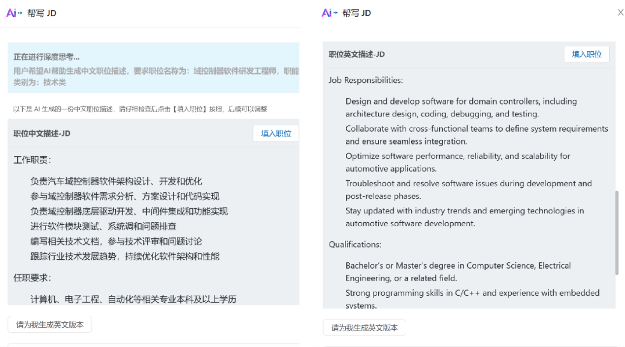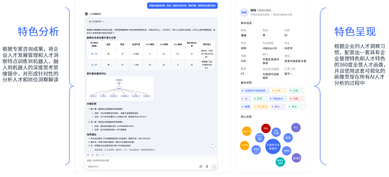 根据专家咨询成果,将企业人才发展管理和人才洞察特点训练到机器人,融入至机器人深度思考思维链中,从而形成针对性人才分析和岗位洞察解读;