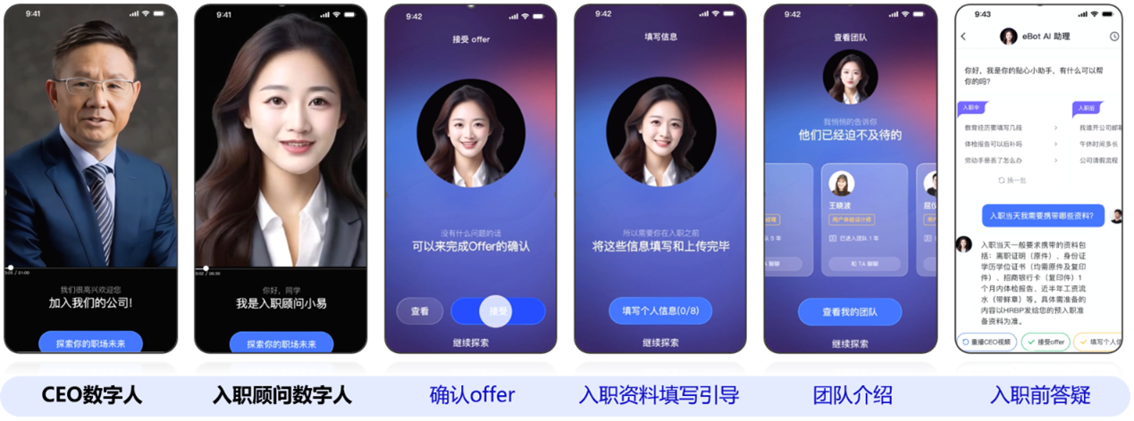 CEO数字人迎新:企业CEO等关键人物拟人化形象呈现迎新祝福,在新员工入职前就触达,令其从接触伊始就能感受企业创新、人性化关怀,从而奠定优质体验文化的基调。