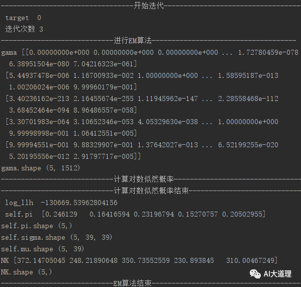 五次迭代,每次迭代后对数似然概率都在增大。