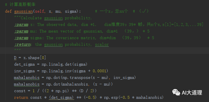 高斯概率:gaussian(X[n], self.mu[k], self.sigma[k])