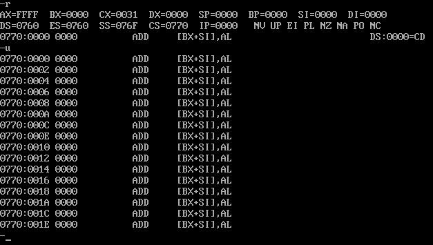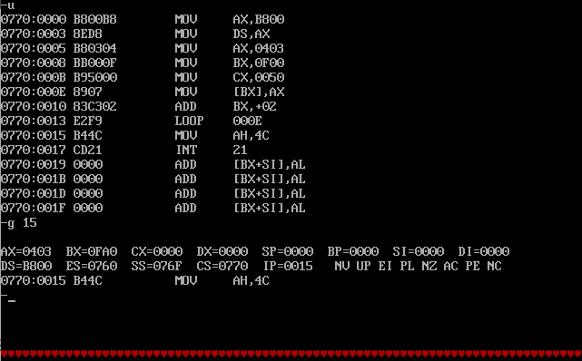 assume cs:code code segment start: mov ax,0b800h mov ds,ax mov ax,0403h mov bx,0f00h mov cx,50h s: mov [bx],ax add bx,2 loop s mov ah,4ch int 21h code ends end start