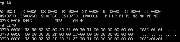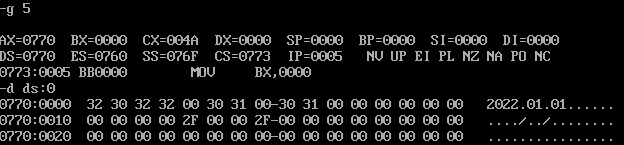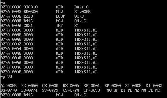 assume cs:code data1 segment db 50, 48, 50, 50, 0, 48, 49, 0, 48, 49 ; ten numbers data1 ends data2 segment db 0, 0, 0, 0, 47, 0, 0, 47, 0, 0 ; ten numbers data2 ends data3 segment db 16 dup(0) data3 ends code segment start: mov ax,data1 mov ds,ax mov bx,0 mov cx,0ah s: mov ax,[bx] add ax,10h[bx] mov 20h[bx],ax inc bx loop s mov ah,4ch int 21h code ends end start