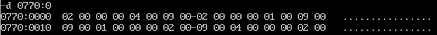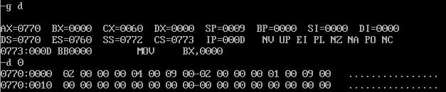 ① 在debug中将执行到line17结束、line19之前,记录此时:寄存器(DS) = __0770__, 寄存器(SS)