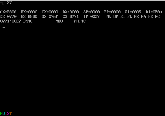assume cs:code, ds:data data segment db 'Nuist' ;db 2, 3, 4, 5, 6 db 5 dup(2) data ends code segment start: mov ax, data mov ds, ax mov ax, 0b800H mov es, ax mov cx, 5 mov si, 0 mov di, 0f00h s: mov al, [si] and al, 0dfh mov es:[di], al mov al, [5+si] mov es:[di+1], al inc si add di, 2 loop s mov ah, 4ch int 21h code ends end start