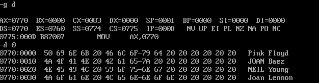 assume cs:code, ds:data, ss:stack data segment db 'Pink Floyd ' db 'JOAN Baez ' db 'NEIL Young ' db 'Joan Lennon ' data ends stack segment dw 1 dup(?) stack ends code segment start: mov ax,stack mov ss,ax mov sp,1 mov ax,data mov ds,ax mov ax,data mov es,ax mov cx,4 s: push cx mov bx,0 mov cx,4 s2: mov al,es:[bx] or al,20h mov es:[bx],al inc bx loop s2 pop cx mov ax,es inc ax mov es,ax loop s mov ah, 4ch int 21h code ends end start