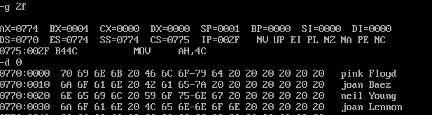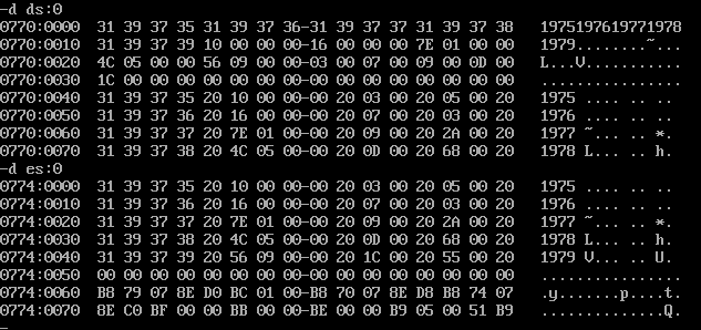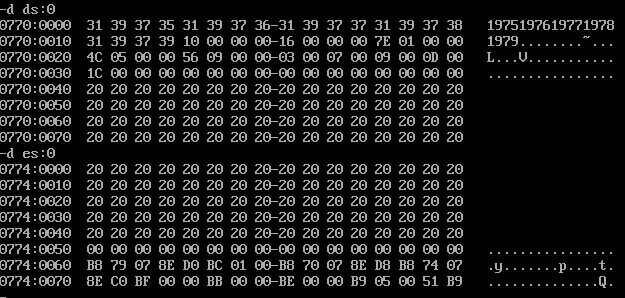 assume cs:code, ds:data, es:table,ss:stack data segment db '1975', '1976', '1977', '1978', '1979' dd 16, 22, 382, 1356, 2390 dw 3, 7, 9, 13, 28 data ends table segment db 5 dup( 16 dup(' ') ) ; table ends stack segment dw 1 dup(?) stack ends code segment start: mov ax,stack mov ss,ax mov sp,1 mov ax,data mov ds,ax mov ax,table mov es,ax mov di,0;data ;1 mov bx,0;table mov si,0;table mov cx,5 year: push cx mov cx,4 year2: mov al,ds:[di] mov es:[bx+si],al inc si inc di loop year2 pop cx add bx,10h mov si,0 loop year ;2 mov bx,0 mov si,5 mov cx,5 income: push cx mov cx,4 income2: mov al,ds:[di] mov es:[bx+si],al inc si inc di loop income2 pop cx add bx,10h mov si,5 loop income ;3 mov bx,0 mov si,10 mov cx,5 num: push cx mov cx,2 num2: mov al,ds:[di] mov es:[bx+si],al inc si inc di loop num2 pop cx add bx,10h mov si,10 loop num ;4 mov bx,0 mov si,5 mov cx,5 cal: mov ax,word ptr es:[bx+si] add si,2 mov dx,word ptr es:[bx+si] add si,3 div word ptr es:[bx+si] add si,3 mov word ptr es:[bx+si],ax add bx,10h mov si,5 loop cal mov ah, 4ch int 21h code ends end start