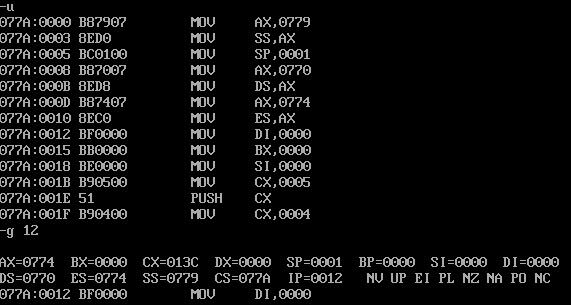 ② 假设程序加载后,code段的段地址是X,则,data段的段地址是__X-2__, stack的段地址是