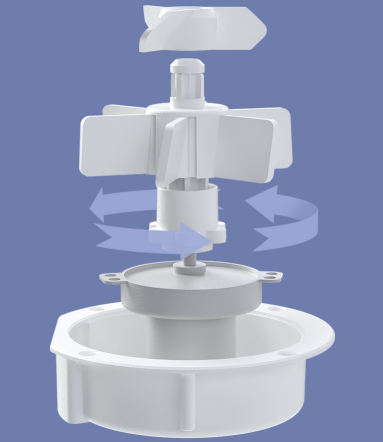 搜索了一下,目前市面上宠物喂食器,核心部分基本都是这种结构,中间是个转轮,上下是成对角的两个扇形。粮食从上边漏下,被转动的转轮带到底部的另一边的扇形再漏到盘子里。