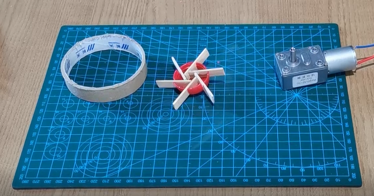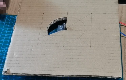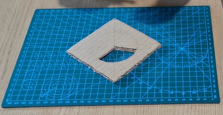 4.做一个边长 20cm 的正方形,中心割同样大小扇形,中间根据电机柱大小,割一个小圆能让电机伸出。