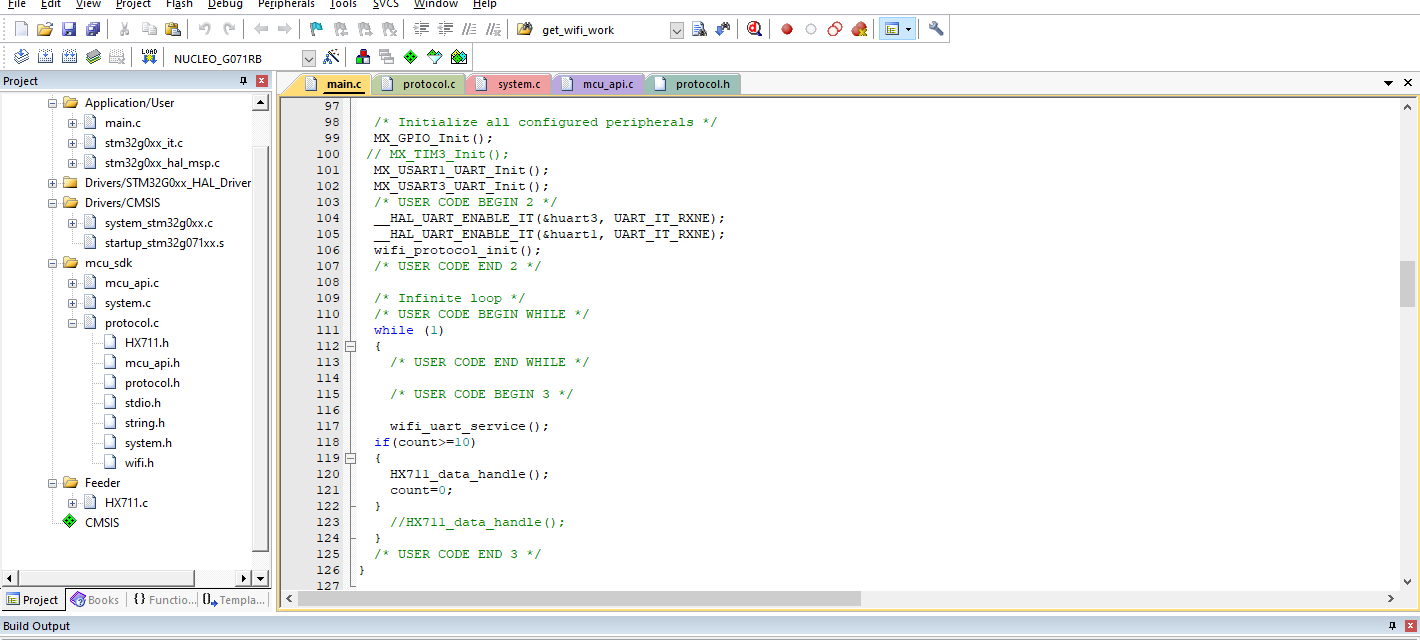 7.拿出开发板,代码编写。主控 MCU 手头有一个ST的 STM32G071 的开发板,Wi-Fi 模组和 MOS 驱动板,用的涂鸦三明治开发板。