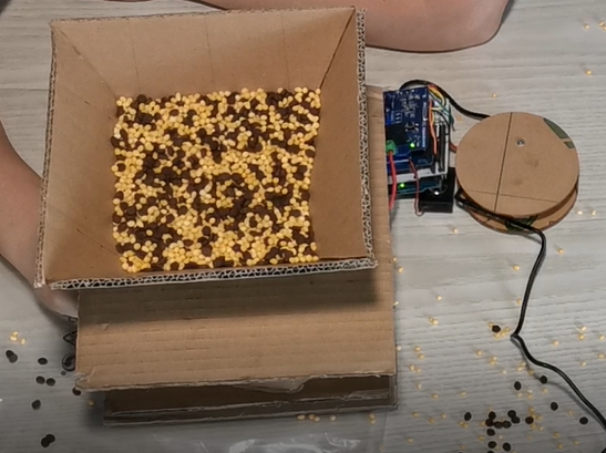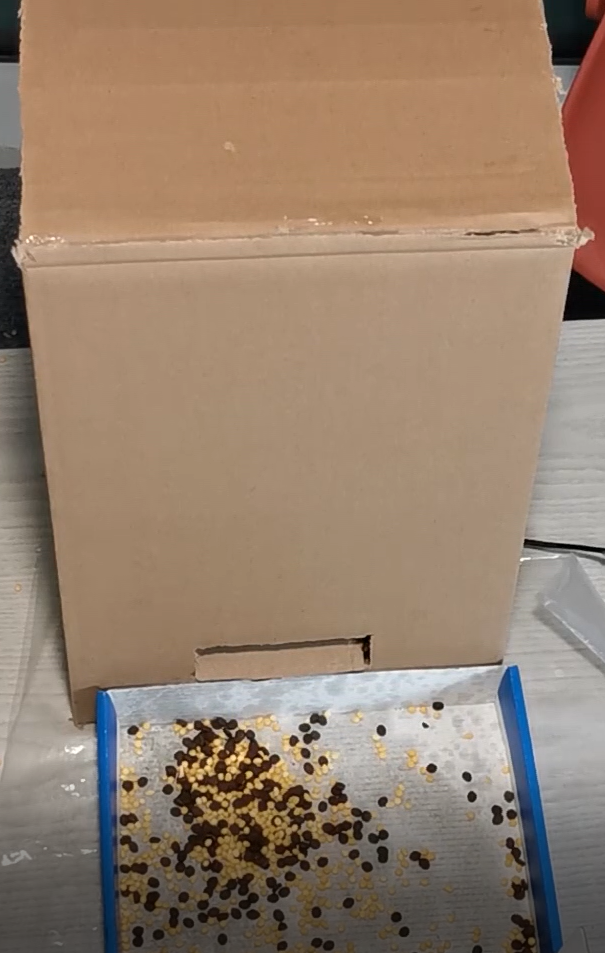 8.装粮调试。实际测试时候,总的感觉,纸箱的精确度还是有些要求的,减速电机的力气基本可满足需求,不过需要转轮的螺丝拧紧。中间有几次转轮的螺丝打滑造成了卡顿,后来加上垫片好了很多。后续如果有机会,转轮和电机的结构应该还会再优化一下。
