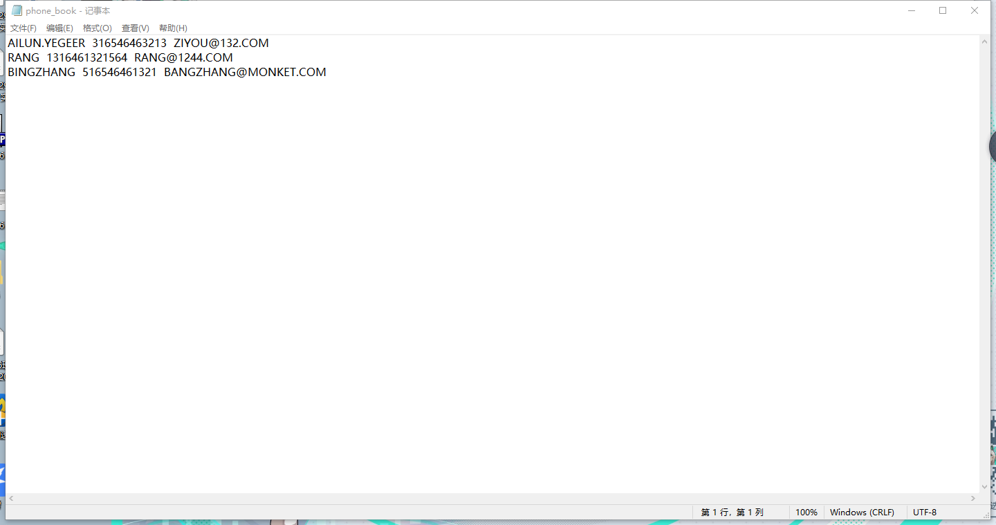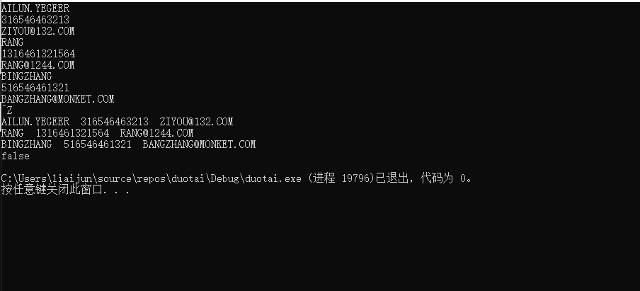 #include <iostream> #include <fstream> #include <vector> #include "Person.hpp" int main() { using namespace std; vector<Person> phone_book; Person p; while (cin >> p) phone_book.push_back(p); for (auto& i : phone_book) cout << i << endl; cout << boolalpha << (phone_book.at(0) == phone_book.at(1)) << endl; ofstream fout; fout.open("phone_book.txt"); if (!fout.is_open()) { cerr << "fail to open file phone_book.txt\n"; return 1; } for (auto& i : phone_book) fout << i << endl; fout.close(); }