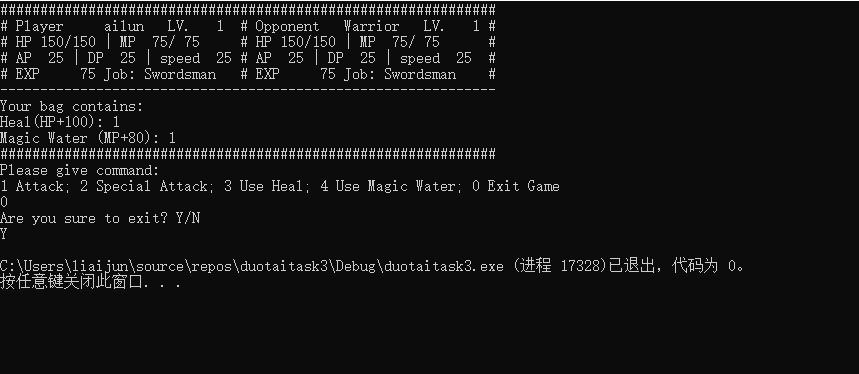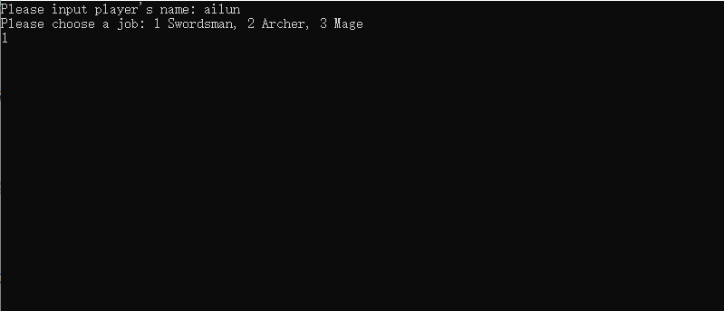 #include <iostream> #include <string> using namespace std; #include "container.hpp" #include"player.hpp" #include"swordman.hpp" int main() { string tempName; bool success = 0; //flag for storing whether operation is successful cout << "Please input player's name: "; cin >> tempName; // get player's name from keyboard input player* human; // use pointer of base class, convenience for polymorphism int tempJob; // temp choice for job selection do { cout << "Please choose a job: 1 Swordsman, 2 Archer, 3 Mage" << endl; cin >> tempJob; system("cls"); // clear the screen switch (tempJob) { case 1: human = new swordsman(1, tempName); // create the character with user inputted name and job success = 1; // operation succeed break; default: break; // In this case, success=0, character creation failed } } while (success != 1); // so the loop will ask user to re-create a character int tempCom; // temp command inputted by user int nOpp = 0; // the Nth opponent for (int i = 1; nOpp < 5; i += 2) // i is opponent's level { nOpp++; system("cls"); cout << "STAGE" << nOpp << endl; cout << "Your opponent, a Level " << i << " Swordsman." << endl; system("pause"); swordsman enemy(i, "Warrior"); // Initialise an opponent, level i, name "Junior" human->reFill(); // get HP/MP refill before start fight while (!human->death() && !enemy.death()) // no died { success = 0; while (success != 1) { showinfo(*human, enemy); // show fighter's information cout << "Please give command: " << endl; cout << "1 Attack; 2 Special Attack; 3 Use Heal; 4 Use Magic Water; 0 Exit Game" << endl; cin >> tempCom; switch (tempCom) { case 0: cout << "Are you sure to exit? Y/N" << endl; char temp; cin >> temp; if (temp == 'Y' || temp == 'y') return 0; else break; case 1: success = human->attack(enemy); human->isLevelUp(); enemy.isDead(); break; case 2: success = human->specialatt(enemy); human->isLevelUp(); enemy.isDead(); break; case 3: success = human->useHeal(); break; case 4: success = human->useMW(); break; default: break; } } if (!enemy.death()) // If AI still alive enemy.AI(*human); else // AI died { cout << "YOU WIN" << endl; human->transfer(enemy); // player got all AI's items } if (human->death()) { system("cls"); cout << endl << setw(50) << "GAME OVER" << endl; delete human; // player is dead, program is getting to its end, what should we do here? system("pause"); return 0; } } } delete human;// You win, program is getting to its end, what should we do here? system("cls"); cout << "Congratulations! You defeated all opponents!!" << endl; system("pause"); return 0; }