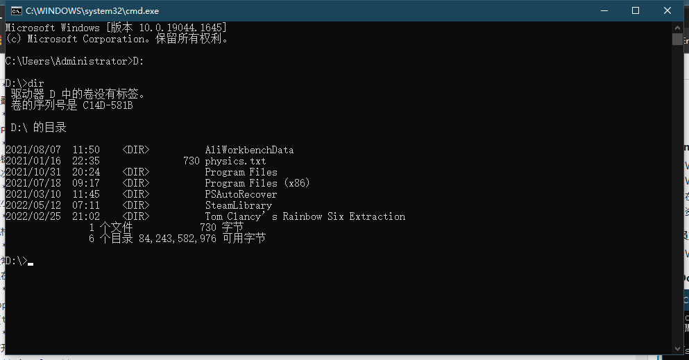 #切换目录:cd change directory 输入cd /d+想要切换的盘,cd ..为切换至上一级菜单,cd 文件名 进入文件`