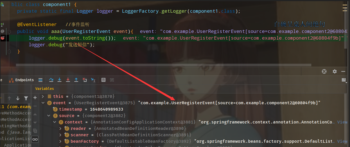 要有一个时间发布类和一个事件监听类,事件通过context 对象发布,这个对象可以通过 @AutoWire自动注入