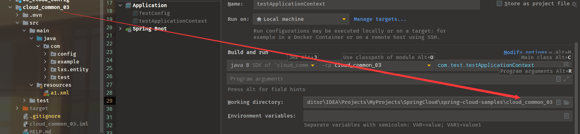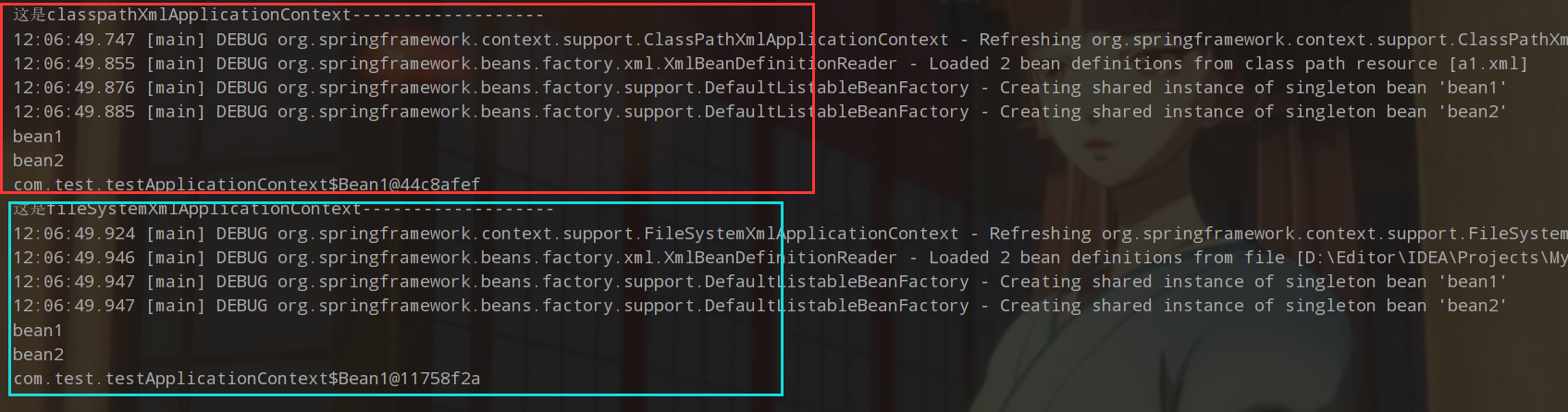 public static void main(String[] args) { classpathXmlApplicationContext(); fileSystemXmlApplicationContext(); } public static void classpathXmlApplicationContext(){ System.out.println("这是classpathXmlApplicationContext-------------------"); ClassPathXmlApplicationContext context = new ClassPathXmlApplicationContext("a1.xml"); Arrays.stream(context.getBeanDefinitionNames()).forEach(System.out::println); System.out.println(context.getBean(Bean2.class).getBean1()); } public static void fileSystemXmlApplicationContext(){ System.out.println("这是fileSystemXmlApplicationContext-------------------"); FileSystemXmlApplicationContext context = new FileSystemXmlApplicationContext("src/main/resources/a1.xml"); Arrays.stream(context.getBeanDefinitionNames()).forEach(System.out::println); System.out.println(context.getBean(Bean2.class).getBean1()); }<bean id="bean1" class="com.test.testApplicationContext.Bean1"/> <bean id="bean2" class="com.test.testApplicationContext.Bean2"> <property name="bean1" ref="bean1"/> </bean>指定项目工作目录