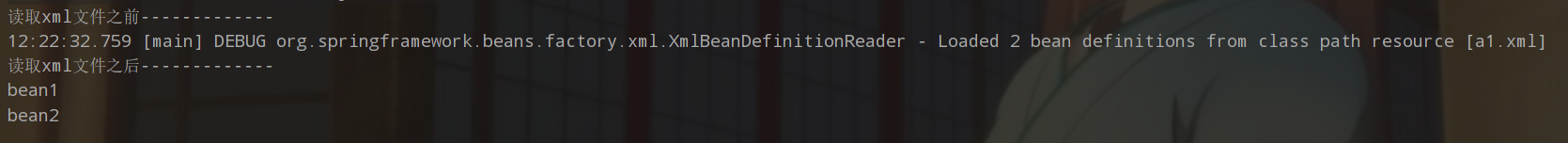 //getBeanName 是自己写的遍历方法 DefaultListableBeanFactory beanFactory = new DefaultListableBeanFactory(); System.out.println("读取xml文件之前-------------"); getBeanName(beanFactory); //读取xml文件的对象 XmlBeanDefinitionReader reader = new XmlBeanDefinitionReader(beanFactory); reader.loadBeanDefinitions(new ClassPathResource("a1.xml")); System.out.println("读取xml文件之后-------------"); getBeanName(beanFactory);