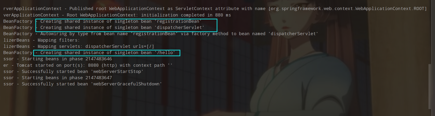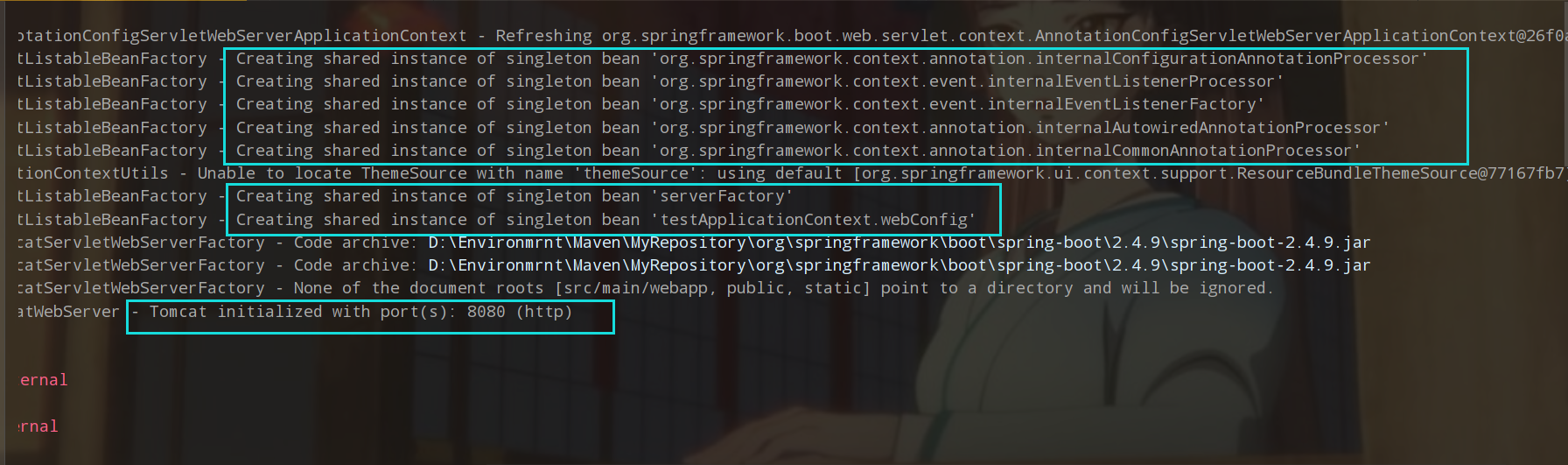 观察控制台:创建顺序:关于的注解和事件监听的后处理器 --> servletFactory --> 配置类webConfig --> 初始化Tomcat -->初始化webApplicationContext --> 创建registrationBean --> 创建dispatcherServlet并注册 / -->创建 controller Bean -->启动 tomcat 和 webservletGracefulShutdown Bean