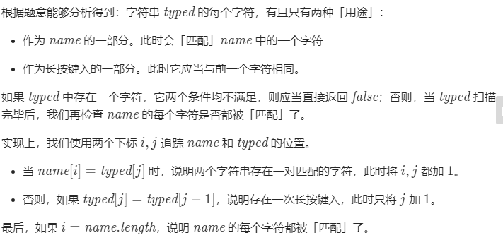 public boolean isLongPressedName(String name, String typed) { char[] n = name.toCharArray(); char[] t = typed.toCharArray(); int i=0;//控制name int j=0;//控制typed if(n[i]!=t[i]) return false; else{ while(i<n.length&&j<t.length){ if(n[i]==t[j]){ i++; j++; } else { if (t[j] == t[j - 1]) j++; else break; } } } if(n[n.length-1]==t[t.length-1]) return (i==n.length); else return false; }