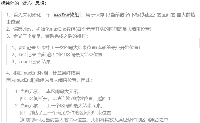 public int videoStitching(int[][] clips, int T) { int[] max_len = new int[T]; int count = 0; //最终结果 int head = 0; // 记录 结果中上一次的最大结束位置(本轮的最小开始位置) int tail = 0; // 记录当前遍历到的 区间最大结束位置 //记录每一个标号可以走到最远的点 for(int[] clip:clips){ if(clip[0]<T){ max_len[clip[0]] = Math.max(max_len[clip[0]],clip[1]); } } for (int i = 0; i < T; i++) { tail = Math.max(tail,max_len[i]); if(i==tail){ return -1; } if(i==head){ count++; head = tail; } } return count; }