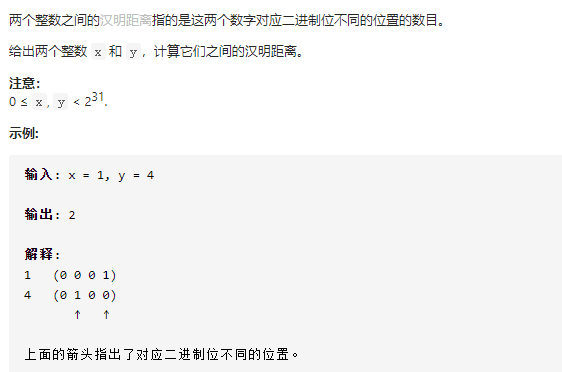 public int hammingDistance(int x, int y) { int count = 0; //将x^y转化为二进制数 String ret = Integer.toBinaryString(x ^ y); //统计'1'的个数 for(int i = 0;i<ret.length();i++){ if(ret.charAt(i) == '1') count++; } return count; }