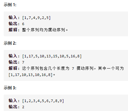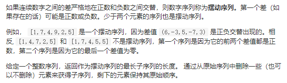public int wiggleMaxLength(int[] nums) { if (nums.length <= 1) return nums.length; else { int up=1; int down=1; for(int i=0;i<nums.length-1;++i){ if(nums[i]-nums[i+1]<0){ down = up+1; } else if(nums[i]-nums[i+1]>0){ up = down+1; } } return up>down?up:down; } }