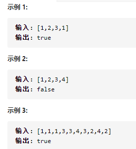 如果任意一值在数组中出现至少两次,函数返回 true 。如果数组中每个元素都不相同,则返回 false 。