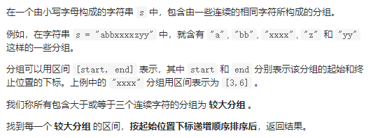 class Solution { public List<List<Integer>> largeGroupPositions(String s) { List<List<Integer>> list = new ArrayList<>(); if(s.length()<3) return list; s+="@"; int start=0; for(int i=1;i<s.length();++i){ if(s.charAt(i)!=s.charAt(start)){ if(i-start>=3){ List<Integer> temp = new ArrayList<>(); temp.add(start); temp.add(i-1); list.add(temp); } start = i; } } return list; } }