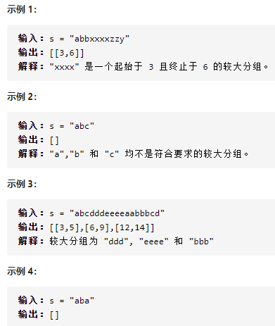class Solution { public List<List<Integer>> largeGroupPositions(String s) { List<List<Integer>> list = new ArrayList<>(); if(s.length()<3) return list; int start=0,end=0;//记录开始、结束位置 for(int i=1;i<s.length();++i){ if(s.charAt(i)!=s.charAt(start)){ if(end-start>1){ List<Integer> temp = new ArrayList<>(); temp.add(start); temp.add(end); list.add(temp); } start = i; } end++; } if(end-start>1){ List<Integer> temp = new ArrayList<>(); temp.add(start); temp.add(end); list.add(temp); } return list; } }