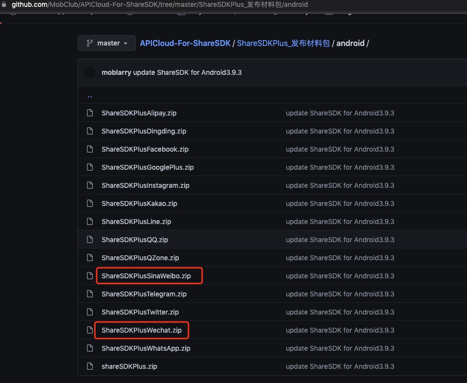 4、Android 平台还需要添加各个对应平台的模块包,需要到 github 下载 。这样做的好处是可以根据所需加不同的模块,比如你只需分享到微信、微博平台,只需下载微信、微博对应的模块包即可。这样编译后的安装包较少。如果默认包含十多个平台,安装包会比较大。