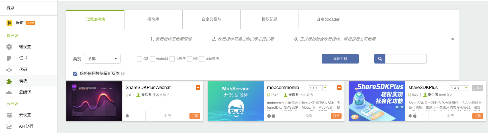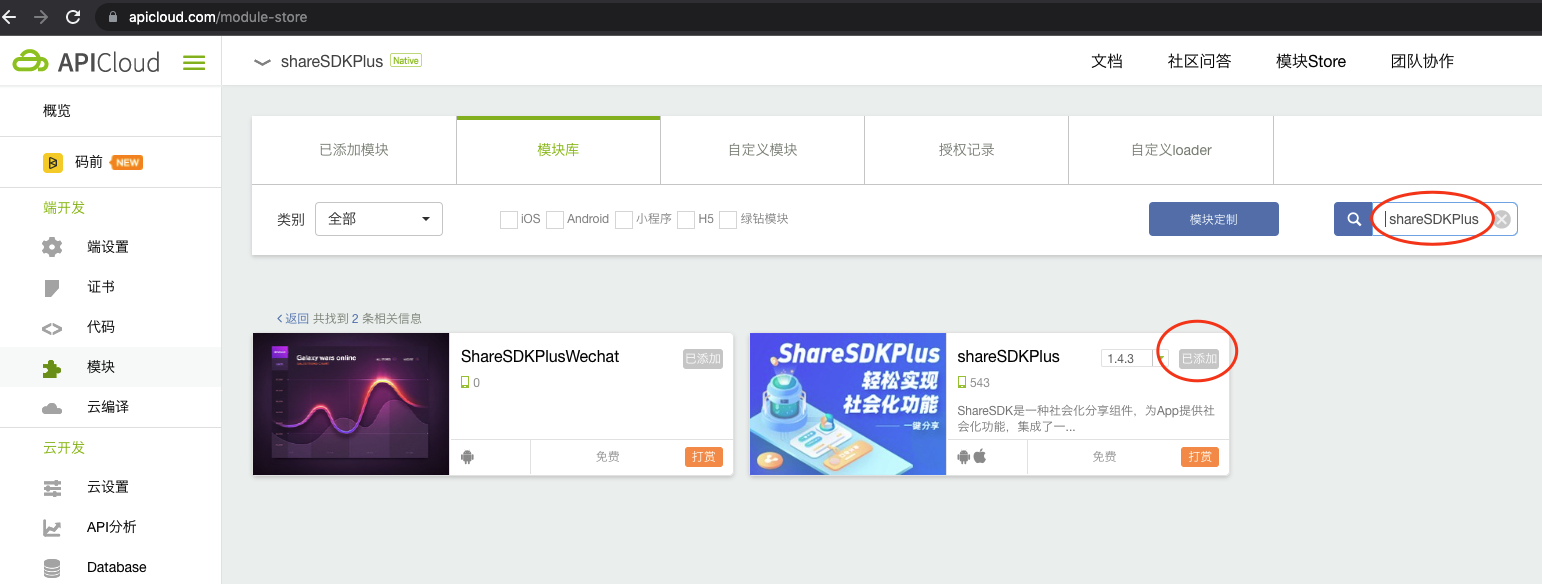 1、在 APICloud 的项目中添加 shareSDKPlus 模块,如下图: