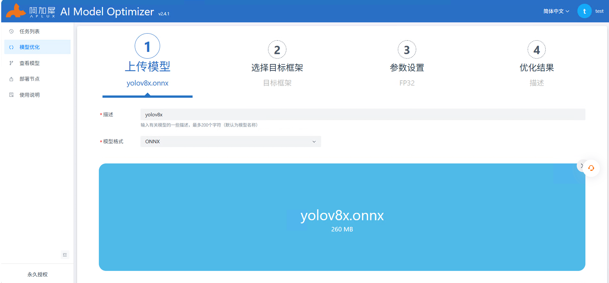 Step1:选择模型优化,模型格式选择onnx格式上传模型
