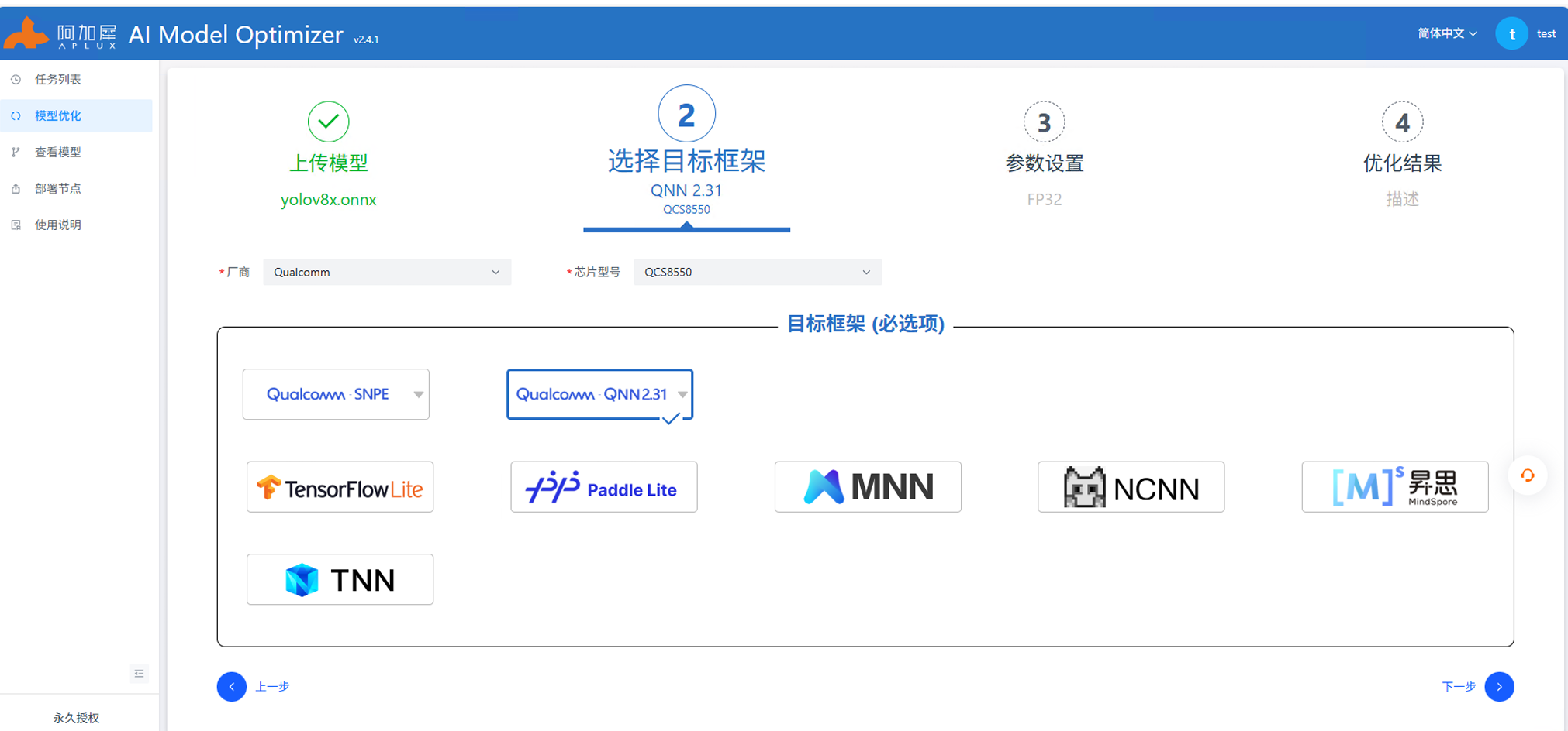 Step2:选择芯片型号以及目标框架,这里我们选择QCS8550+Qnn2.31