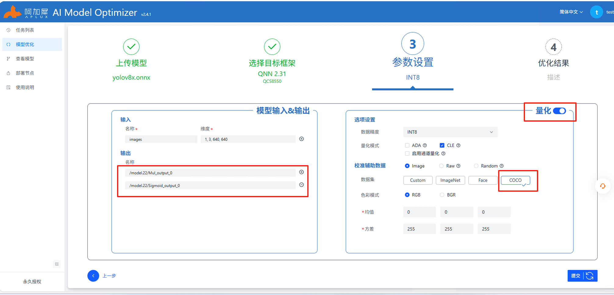 参考上图中红色框部分填写,其他不变,注意开启自动量化功能,AIMO更多操作查看使用说明或开发指南中的AIMO介绍。