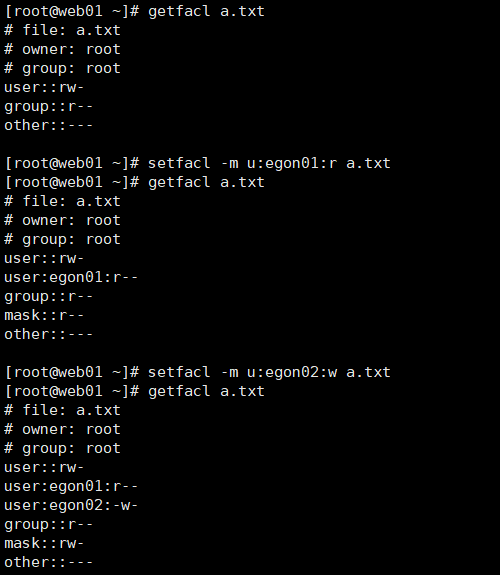 前提:创建需要的用户egon01、egon02,1.txt文件