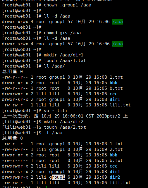 1>针对用户组权限位修改,用户创建的目录或文件所属组和该目录的所属一致。