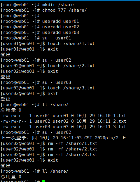 2>若被赋予了粘滞位,除了root可以删除文件,普通用户就算有w权限也只能删除自己建立的文件,而不能删除其他用户建立的文件。