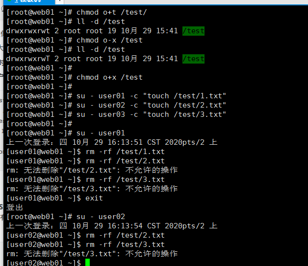 [root@localhost ~]# chmod o+t /test/ 或 chmod 1755 /test
