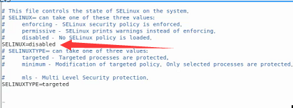 4>输入vim /etc/sysconfig/selinux,修改配置文件,SELINUX=disable;