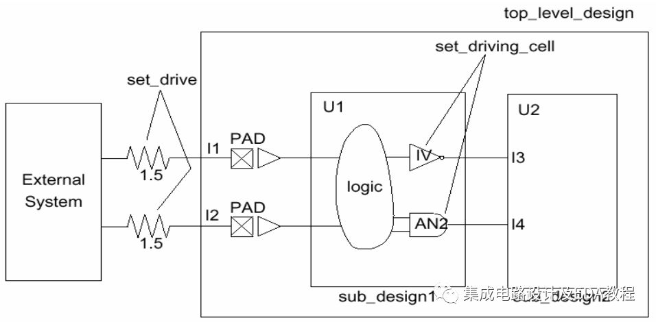 对于Chip level的顶层设计top_level_design而言,芯片外部的电路需要驱动负载较大的PAD,因此需要使用set_drive命令来通过设置电阻值来指定输入端口的驱动强度。