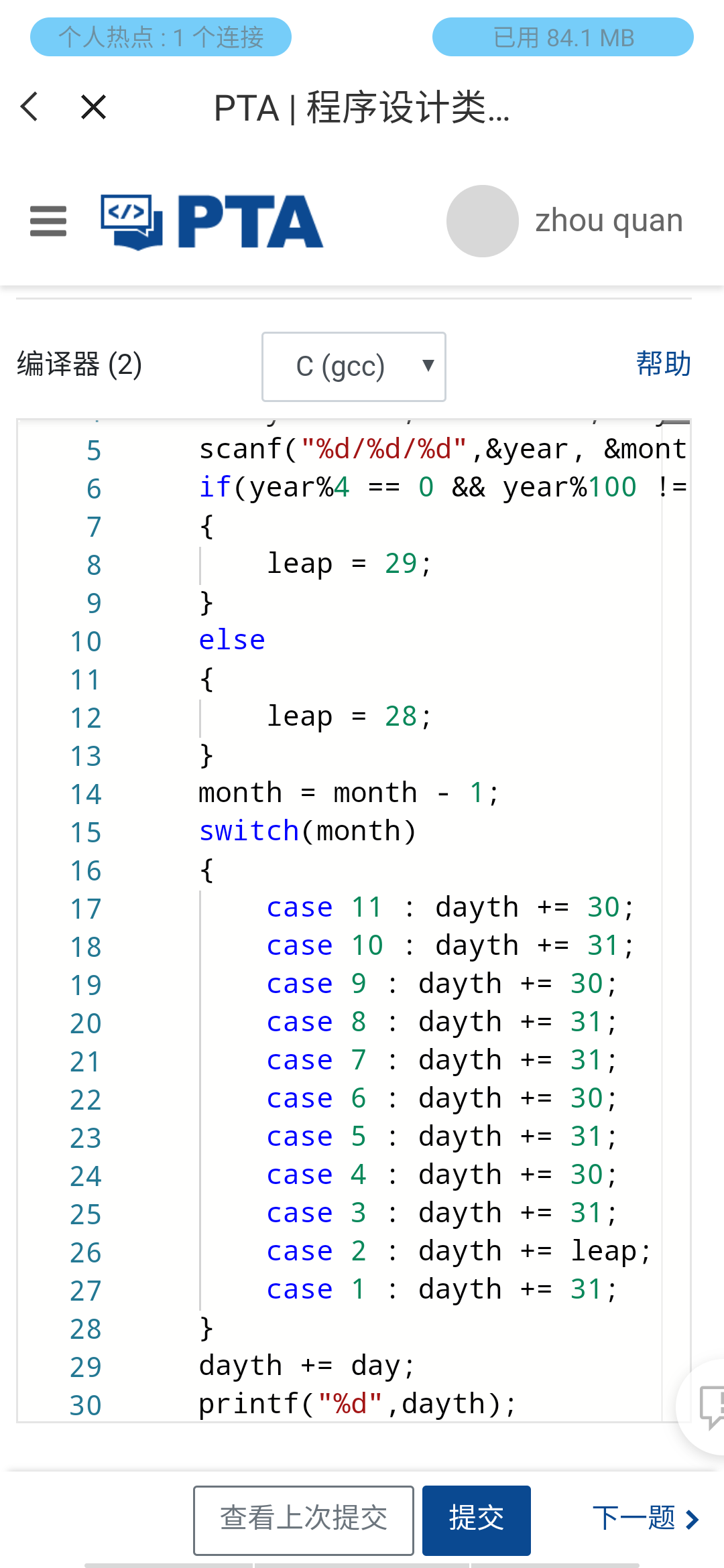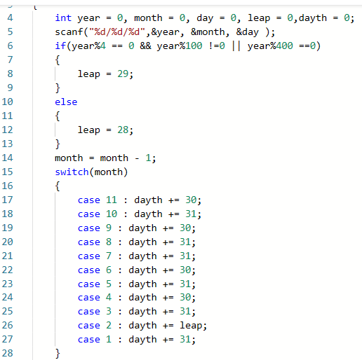 对比:相比而言我觉得自己的简单多了,他的好复杂。它的每个case都单独求出跳出所以每个月都要总和以前的天数。然后他是把平年和闰年分为两种情况分别讨论分别计算出来。我是不跳出的,直接全部计算。每个月分分别累加。符合的月份就会累加,然后执行。最后算出结果总和。然后对于平年和闰年,我就只讨论了二月。