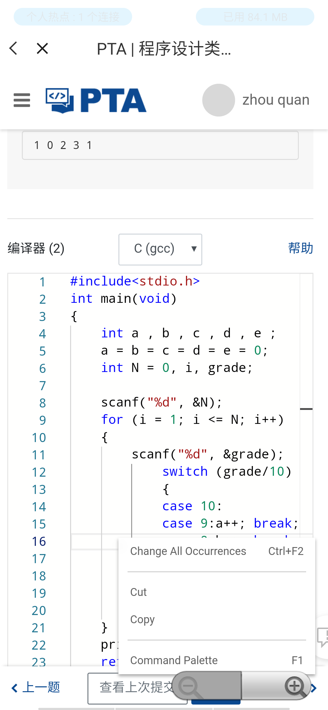 2编译错误:a = b = c = d = e = 0;中少写了一个d 而且switch打成了swich。