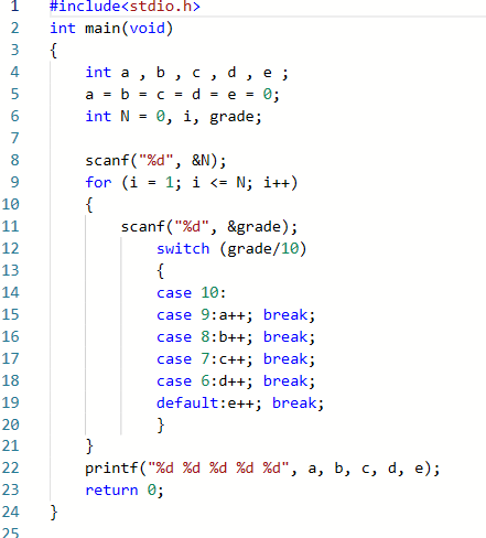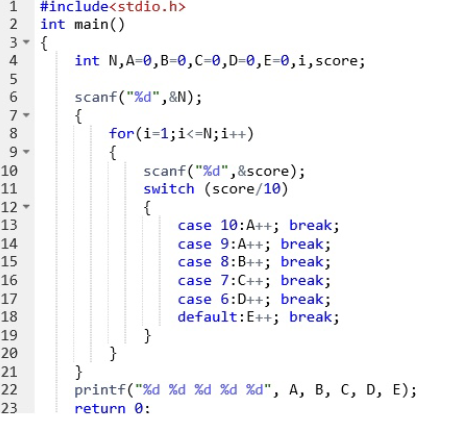 数据处理:i = 1; i <= N; i++ grade/10 switch-case结构。