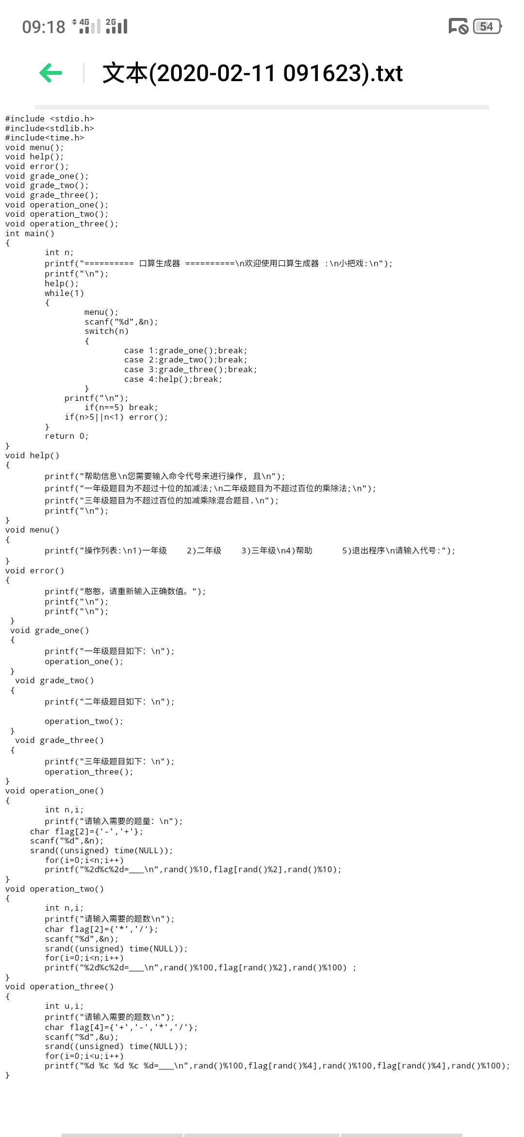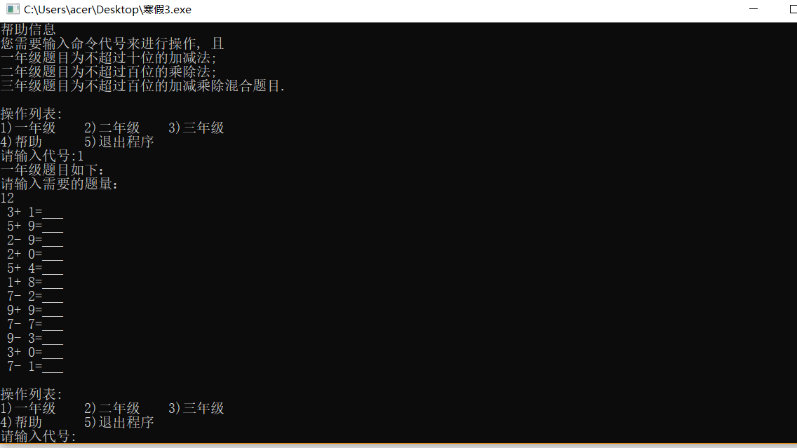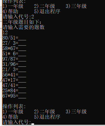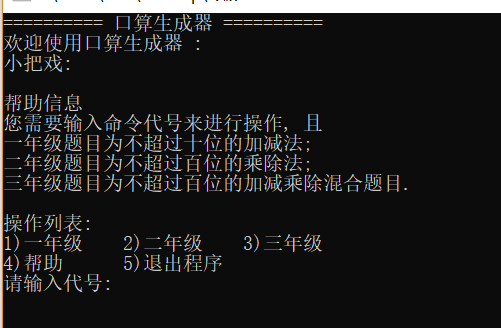 | 这个作业的目标 | 使用上次作业的菜单框架,并在其基础上增加各年级题目操作函数 |