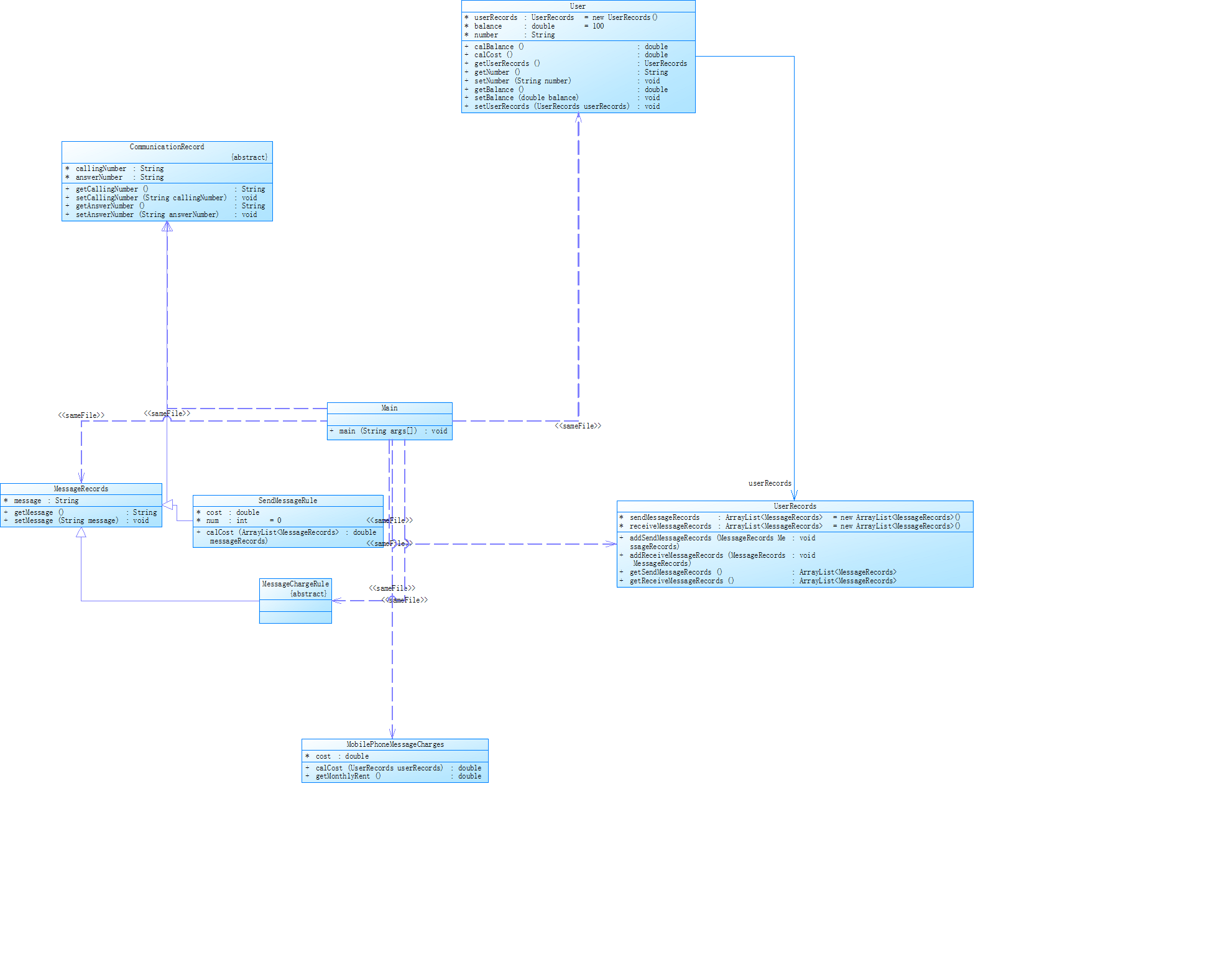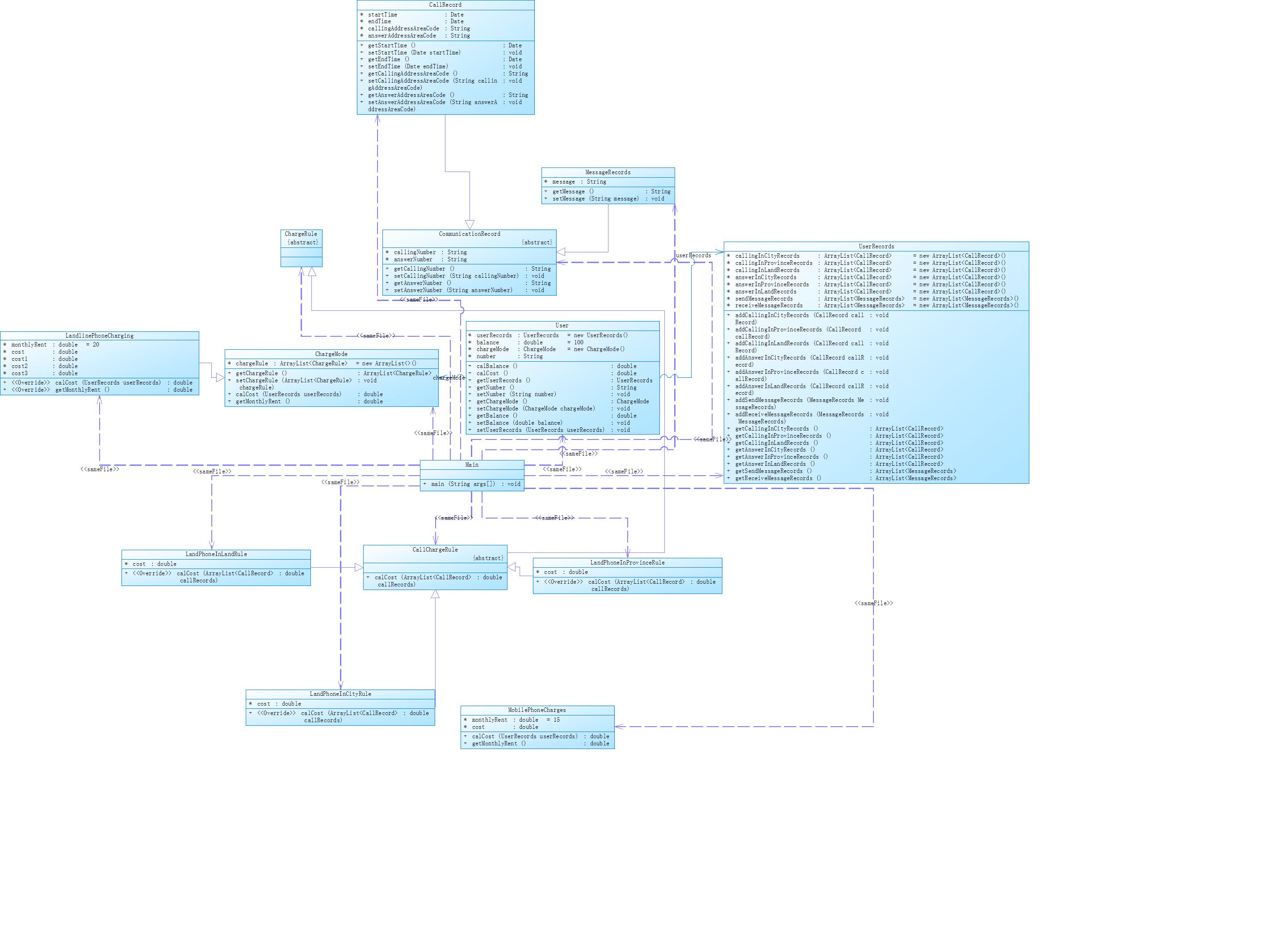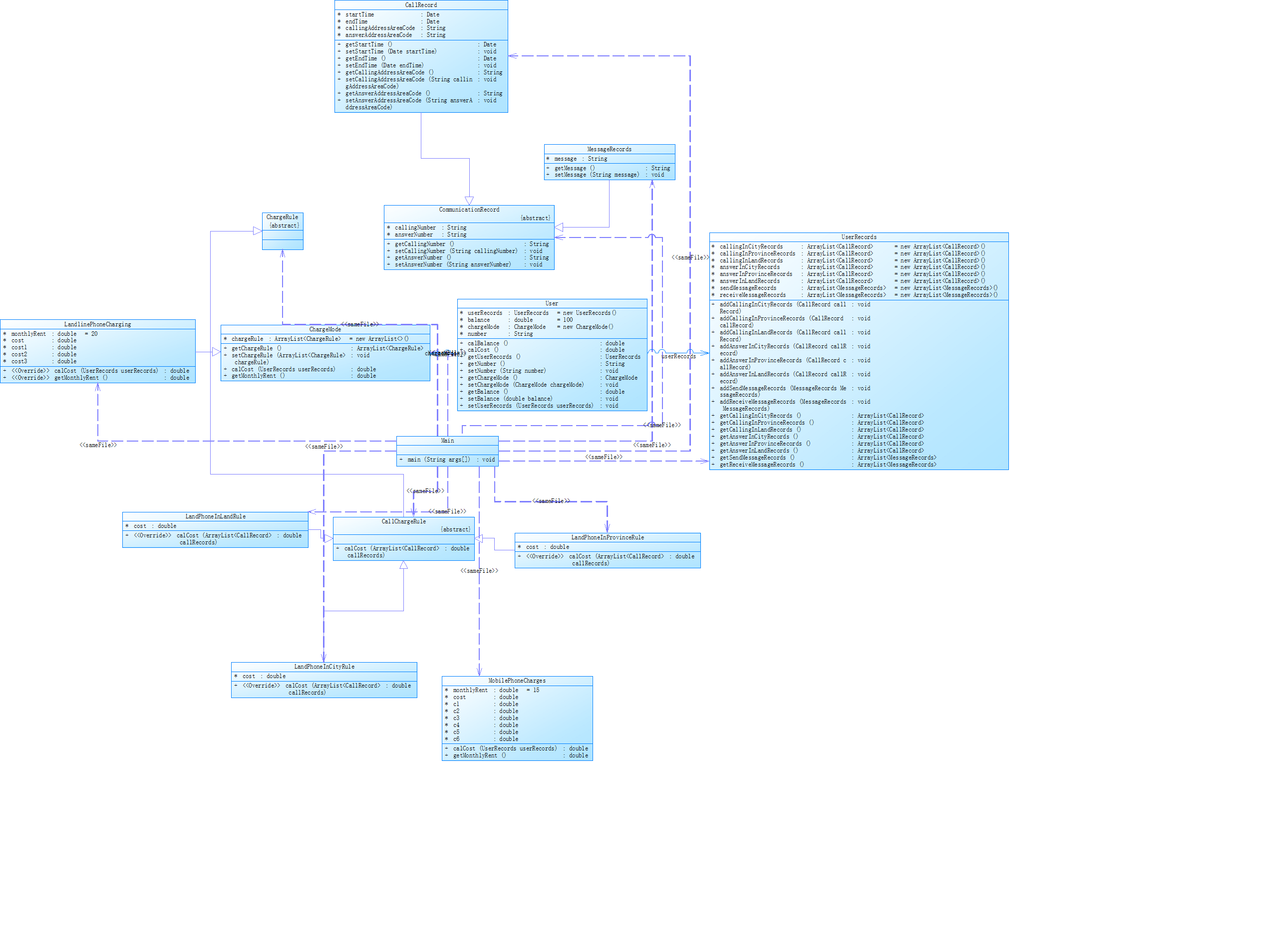 根据题目给出类图编写方法和类。使用while循环一行一行的读取输入内容。每有一条开户信息就新建一个User类,然后读取通话记录储存进User类中的userrecord中。