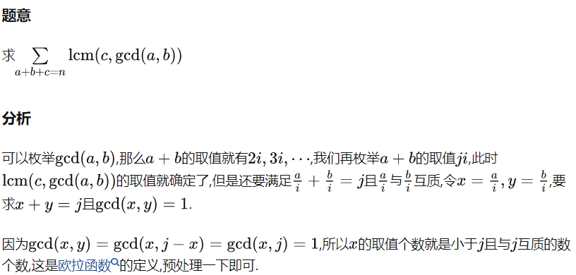 #include<iostream> #include<cstring> #include<vector> #include<algorithm> using namespace std; using LL = long long; const int maxn = 1e5 + 5, mod = 1e9 + 7; template<int T> struct ModInt { const static int mod = T; int x; ModInt(int x = 0) : x(x% mod) {} int val() { return x; } ModInt operator + (const ModInt& a) const { int x0 = x + a.x; return ModInt(x0 < mod ? x0 : x0 - mod); } ModInt operator - (const ModInt& a) const { int x0 = x - a.x; return ModInt(x0 < mod ? x0 + mod : x0); } ModInt operator * (const ModInt& a) const { return ModInt(1LL * x * a.x % mod); } ModInt operator / (const ModInt& a) const { return *this * a.inv(); } void operator += (const ModInt& a) { x += a.x; if (x >= mod) x -= mod; } void operator -= (const ModInt& a) { x -= a.x; if (x < 0) x += mod; } void operator *= (const ModInt& a) { x = 1LL * x * a.x % mod; } void operator /= (const ModInt& a) { *this = *this / a; } friend ostream& operator<<(ostream& os, const ModInt& a) { return os << a.x; } ModInt pow(LL n) const { ModInt res(1), mul(x); while (n) { if (n & 1) res *= mul; mul *= mul; n >>= 1; } return res; } ModInt inv() const { int a = x, b = mod, u = 1, v = 0; while (b) { int t = a / b; a -= t * b; swap(a, b); u -= t * v; swap(u, v); } if (u < 0) u += mod; return u; } }; typedef ModInt<mod> mint; bool isPrime[maxn]; int phi[maxn]; int primes[maxn], cnt; void init() { phi[1] = 1; for (int i = 2; i < maxn; i++) { if (!isPrime[i]) primes[cnt++] = i, phi[i] = i - 1; for (int j = 0; i * primes[j] < maxn; j++) { isPrime[i * primes[j]] = 1; if (i % primes[j] == 0) { phi[i * primes[j]] = phi[i] * primes[j]; break; } phi[i * primes[j]] = phi[i] * (primes[j] - 1); } } } LL __gcd(LL a, LL b) { if (b) return __gcd(b, a % b); else return a; } int main() { cin.tie(0); cout.tie(0); ios::sync_with_stdio(0); auto lcm = [&](int a, int b) { return mint(a / __gcd(a, b)) * mint(b); }; init(); int n; cin >> n; mint ans = 0; for (int i = 1; i <= n; i++) for (int j = 2 * i; j < n; j += i) ans += lcm(i, n - j) * mint(phi[j / i]); cout << ans << '\n'; }