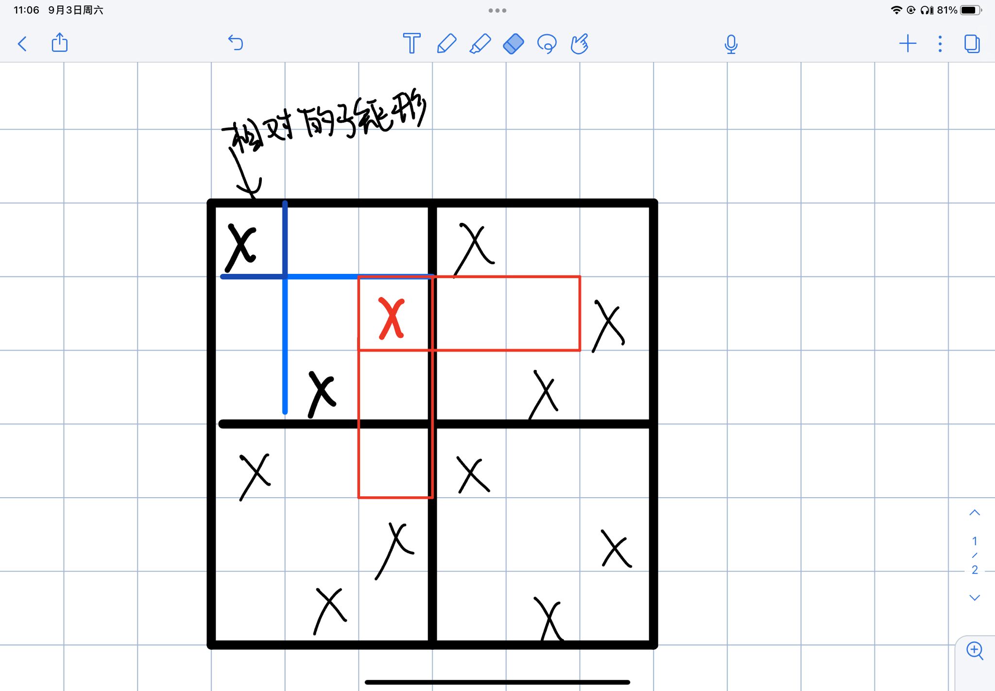 思路: 1.首先我们先不考虑pos(r,c)和小矩形限制,对于任意正方形满足行列至少有一个‘X’,