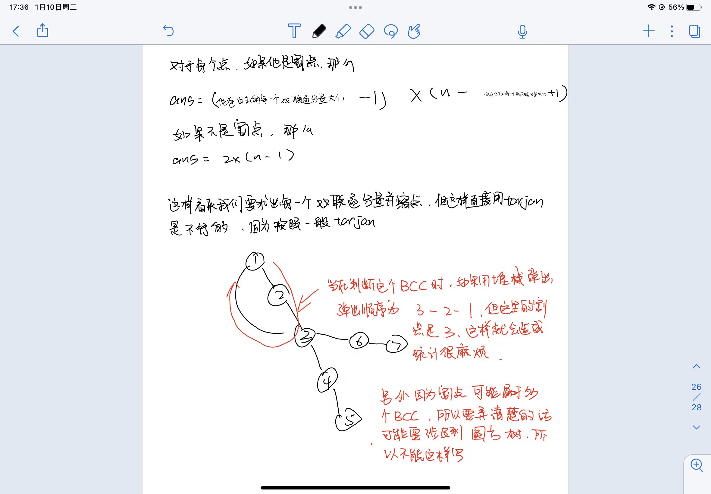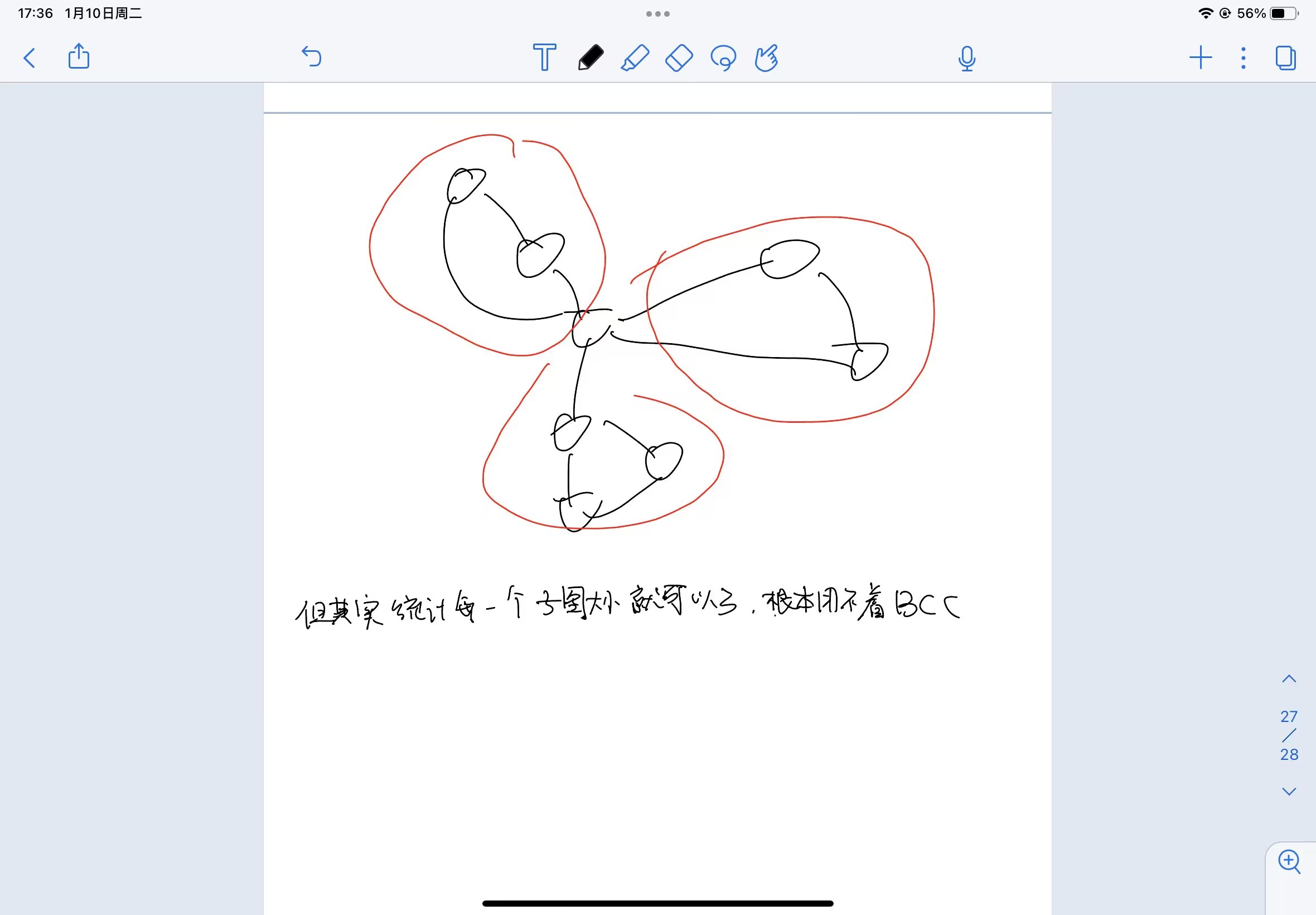 // 题意:对于每一个点,求删去这个点的所有边会形成多少个点对满足两点之间不互通 // 思路:思路很简单,分为这个点是否是割点,但写法上就有点讲究,详情见博客 // /*#include<bits/stdc++.h> using namespace std; const int N = 1e5 + 10; int n, m; vector<int> e[N]; int dfn[N], low[N], idx, cut[N], ans[N], id, sz[N]; void dfs(int u, int f) { dfn[u] = low[u] = ++idx; int ch = 0; sz[id]++; for (auto v : e[u]) { if (!dfn[v]) { dfs(v, u); ch++; low[u] = min(low[u], low[v]); if (low[v] >= dfn[u]) { ans[u] = 2 * (n - sz[id]) * sz[id] + 2 * (n - sz[id] - 1); cut[u] = 1; ++id; } } else if (v != f) { low[u] = min(low[u], dfn[v]); sz[id]++; } } if (u == 1 && ch <= 1) cut[u] = 0; if (cut[u] == 0)ans[u] = 2 * (n - 1); } int main() { cin >> n >> m; id = 1; for (int i = 1; i <= m; i++) { int a, b; cin >> a >> b; e[a].push_back(b); e[b].push_back(a); } dfs(1, -1); for (int i = 1; i <= n; i++) cout << ans[i] << endl; return 0; }*/ #include<bits/stdc++.h> using namespace std; const int N = 1e5 + 10; int n, m; vector<int> e[N]; int dfn[N], low[N], idx, sz[N]; long long ans[N]; void dfs(int u, int f) { dfn[u] = low[u] = ++idx; sz[u] = 1; ans[u] = n - 1; int cut = n - 1; for (auto v : e[u]) { if (!dfn[v]) { dfs(v, u); sz[u] += sz[v]; low[u] = min(low[u], low[v]); if (low[v] >= dfn[u]) { ans[u] += (long long)sz[v] * (n - sz[v]); cut -= sz[v]; } } else if (v != f) { low[u] = min(low[u], dfn[v]); } } ans[u] += (long long)cut * (n - cut); } int main() { cin >> n >> m; for (int i = 1; i <= m; i++) { int a, b; cin >> a >> b; e[a].push_back(b); e[b].push_back(a); } dfs(1, -1); for (int i = 1; i <= n; i++) cout << ans[i] << endl; return 0; }