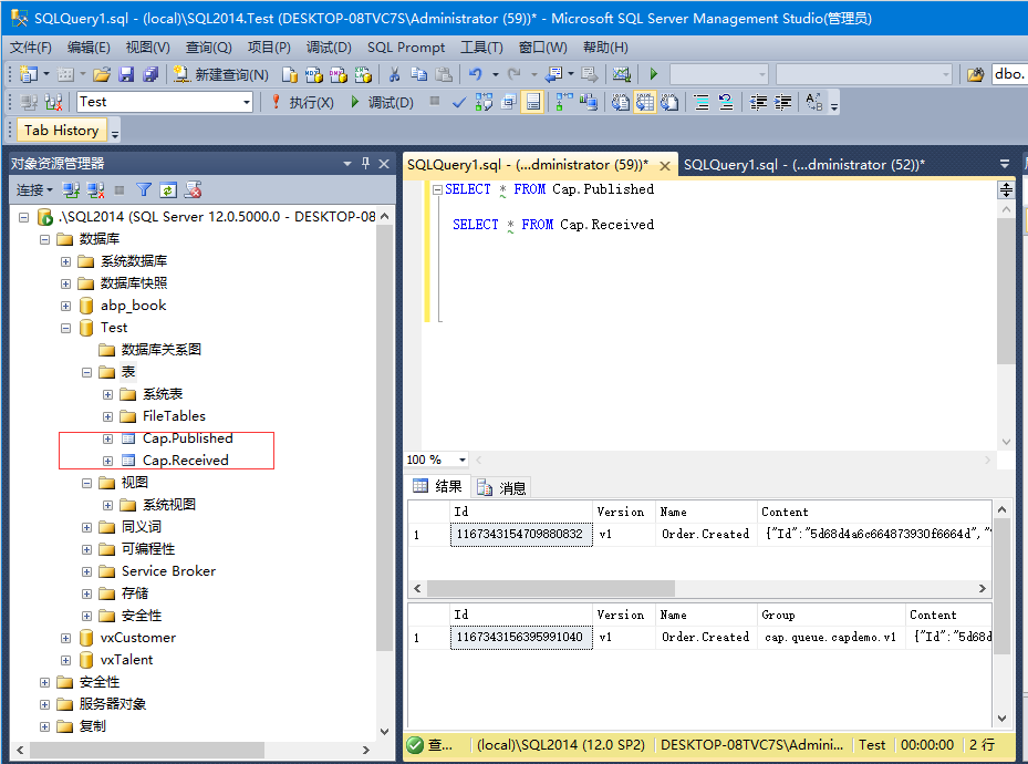 我们再看看数据库里面的变化吧,从下图可以看出CAP自动创建了两个表,并且记录了发布的消息,和接收到的消息。这些数据会定时删除。这些都是不需要我们管的。