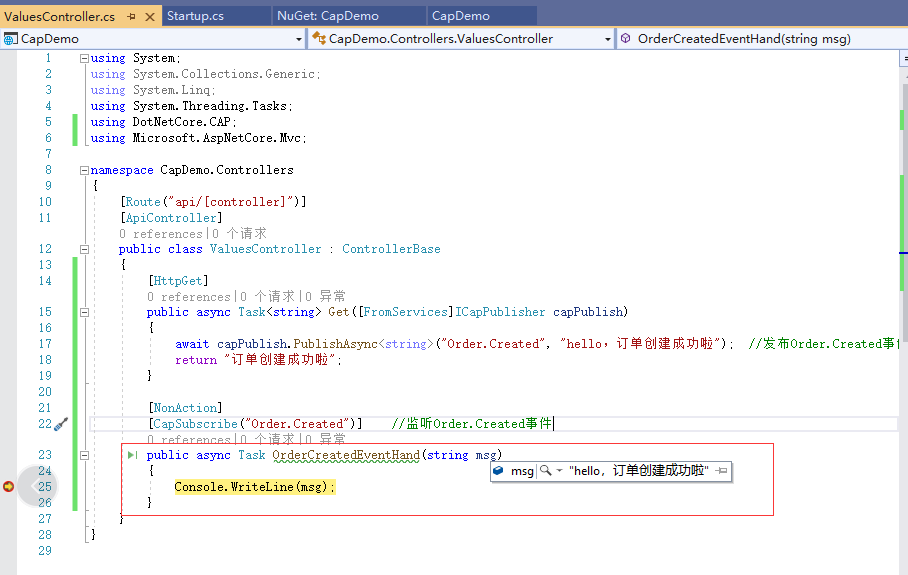 将 CapDemo.Controllers.ValuesController中的所有方法全部删除。添加引用 using DotNetCore.CAP; ,并添加以下方法